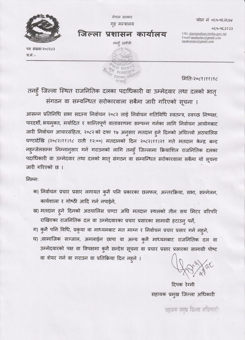 तनहुँ जिल्ला स्थित राजनीतिक दलका पदाधिकारी वा उम्मेदवार तथा दलका भातृ संगठन वा सम्बन्धित सरोकारवाला सबैमा जारी गरिएको सूचना ।